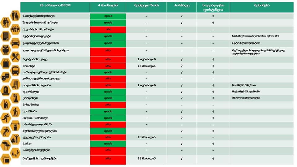 • 4 მაისიდან შესაძლებელი ხდება ბარებსა და რესტორნებში შეკვეთის ადგილზე მიცემა და მისი პირადად გამოტანა (Take away). ბუნებრივია, ძალაში დარჩება აქამდე არსებული შეკვეთის გამოძახების და სახლში მიტანის სერვისიც;